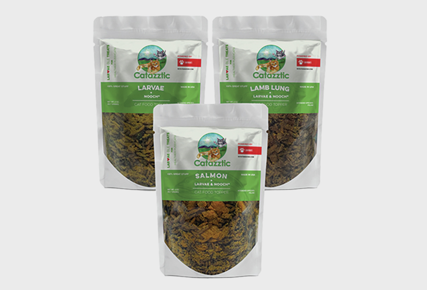 Unique treat line containing the cheesy-tasting nutritional yeast found in black soldier fly larvae. A safe and highly nutritious source of protein and anti-inflammatory fats, plus supports feline digestion. Feeds as a treat, topper or in a treat ball to satisfy the feline hunter instinct. In Larvae, Lamb Lung, and Salmon. 2 oz. Made in the U.S. Women-owned business.