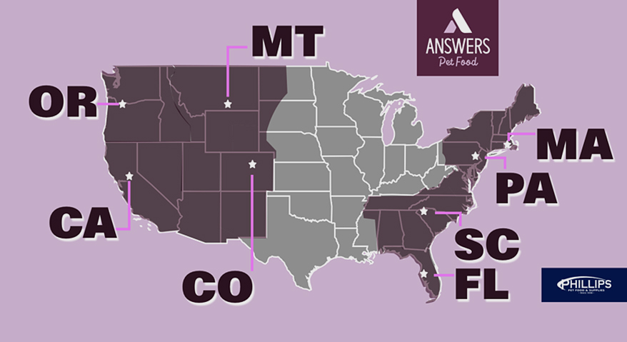 Through this partnership, Phillips will distribute Answers Pet Food’s full line of raw, fermented pet products, making it easier than ever for retailers to access our innovative, high-quality products that support optimal pet health. Phillips Pet has gained distribution capabilities for Answers Pet Food products through the following distribution centers: PA, MA, FL, SC, CA, OR, CO and MT.