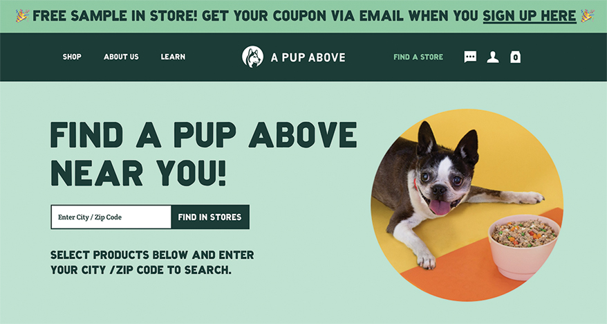 STORE LOCATOR. A Pup Above gives its in-store coupons and store locator top billing online.