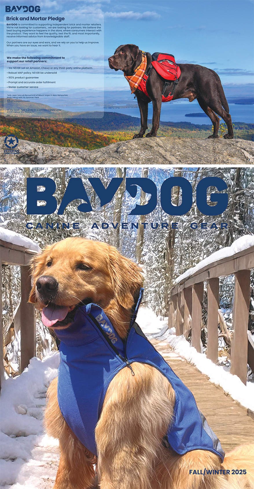 Walk into the BAYDOG booth at any trade show and you’ll see among the many harnesses, life jackets and other gear on display a sign that reads, “No Amazon. No Chewy. No eBay.” Founder and CEO Barton O’Brien takes great pride in this core company value. “Our business is built on the back of the ‘Brick and Mortar Pledge’ that has been on the first page of every catalog since we launched in 2018. Our commitment to our retail partners is that if they carry BAYDOG, they will never lose a sale to an online retailer. BAYDOG isn’t sold on any third-party platform. We have a strict MAP policy, and nothing on baydog.com is ever on sale.” The company’s website also has a store locator.
