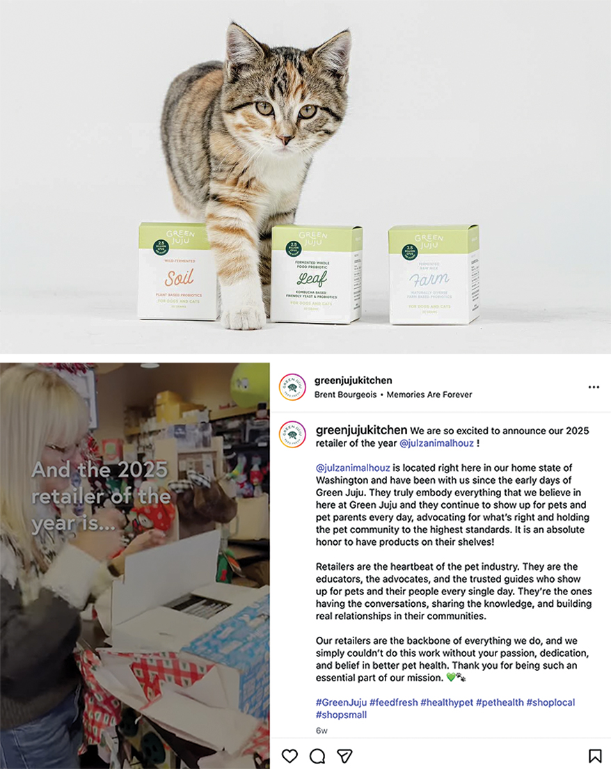 Founder Kelley Marian shares the love back. “Our independent brick-and-mortar retailers are the heart of our business. They’re the stores that accepted products out of the back of my pickup truck more than a decade ago — the ones who believed in my story, told it to their customers, and shared my passion for the greens that started this company. While we’ve grown well beyond my original delivery route, retailers across the country continue to share our mission of feeding fresh. They are trusted voices in their communities, guiding pet parents on how to best care for their animals. Nothing will ever replace the deep connection independent retailers have with their customers, and we are incredibly grateful that they choose to spend their few precious minutes with shoppers talking about Green Juju.”