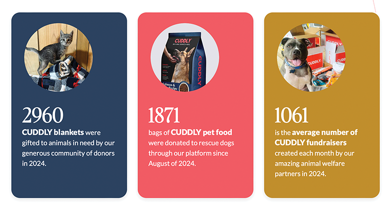 Does CUDDLY have a give-back program? For every bag of food purchased, CUDDLY donates a meal to a rescue animal in need. Since 2024, the CUDDLY shop has donated 5,000+ meals to rescue animals in need through our partnership with 4,000+ shelter and rescue organizations.