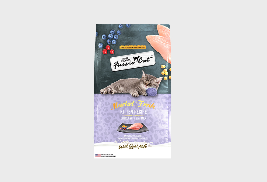 Available online and at retailers throughout North America in February 2026, Fussie Cat Super Premium Market Fresh Dry Kitten Recipe Chicken with Goat Milk is offered in 3.5 lbs. bags (MSRP: $16.99) for easy handling and convenient pantry storage, and 10 lbs. bags (MSRP: $37.99) for increased value at the same amazing quality.
