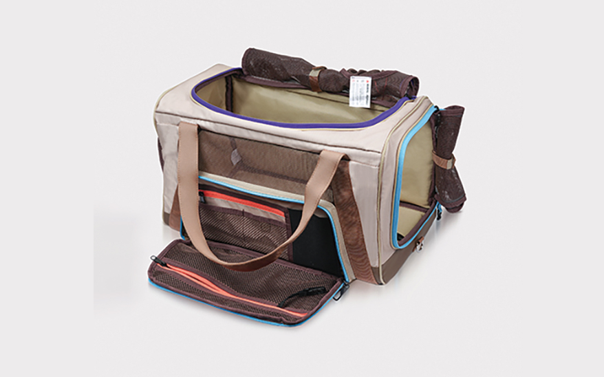 The newly updated soft-sided travel carrier for dogs, cats and bunnies features extra durability, more interior space, five-side ventilation, and a shoulder strap that converts to a leash. Includes self-locking zippers, faux-fleece comfort padding with composite base insert and an expandable port. Meets airline requirements. In Platinum Gray, Deja Blue and Charcoal Ash. 18.5 by 11.75 by 11.5 in. Family-owned business. On Faire and direct.