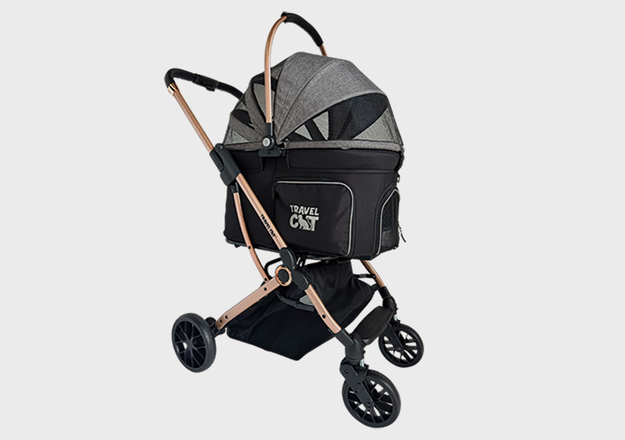 Built for real-life cat parents, the stroller’s removable waterproof bed and tray sits in a detachable bassinet that doubles as a car-seat carrier. Spacious undercarriage basket for treats and water bottles. Includes full shock system, lightweight EVA wheels with 360-degree swivel front, plus lock and one-step brake system. Reflective piping and compact folding frame. Stroller: 26.4 by 20 by 39 in. Bassinet: 25 by 12 in. Family- and woman-owned business.