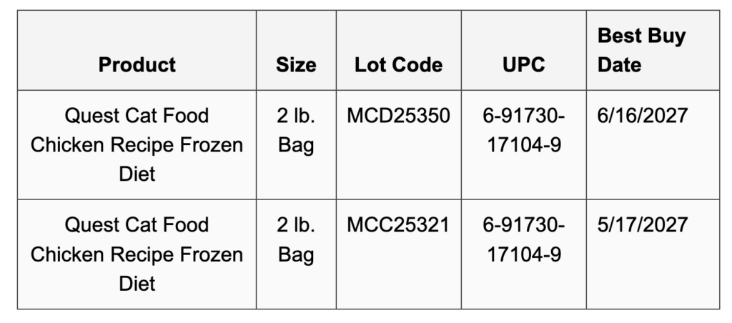 The two lots of Quest Cat Food Chicken Recipe Frozen (MCD25350 BB 5/17/2027 and MCC25321 BB 6/16/2027) are sold in beige, zip-lock, 2lb packages and distributed nationwide. The company has also decided to stop the sale of all Quest products at all retailers until the issue of thiamine content in the products is addressed.