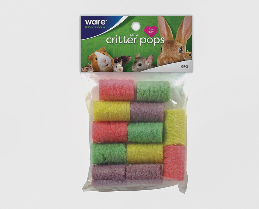 Wholesome, crispy, crunchy chews that promote clean and healthy teeth while helping overcome cage boredom. For rabbits, guinea pigs, chinchillas, hamsters, mice and pet rats. Animal-safe food colors. Ideal for hand placement on the Ware Treat-K-Bob treat dispenser. S and L. Family-owned business.