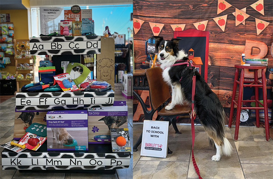 1 It’s BACK TO SCHOOL time! Pets can take part, too, as Barkley’s Marketplace in Flemington, NJ, proved in 2024. A themed product display featured a School Supplies list complete with New Clothes (collar, harness and leash) and ABCs (training tools), plus items for the Backpack and Lunch Box (treats and food) and for Quiet Time (puzzle toys and chews). Fun black-and-white alphabet strips lined the shelves. Nearby, a photo set let pups get their class pics! Bonus: Michele Saharic scored treat sponsorships for the very good boys and girls smiling for the camera.