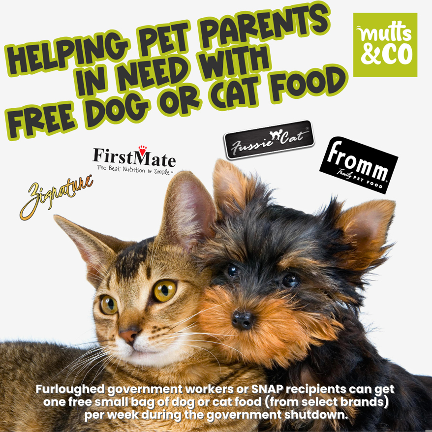 Furloughed government employees and SNAP recipients whose benefit have been impacted can receive one free small bag of dog or cat food per week during the government shutdown. They simply show their government ID or EBT card at a Mutts & Co. store.