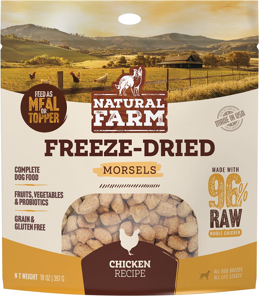 1. Freeze Dried Morsels Chicken Recipe Our Freeze-Dried Patties and Morsels are made with a high percentage of raw, nutrient-rich ingredients, including organ meat and vital proteins. This simple blend of protein, fruits, vegetables, and probiotics offers nutrient-dense fuel for your dog, just as nature intended. Product and MSRP Coming Soon