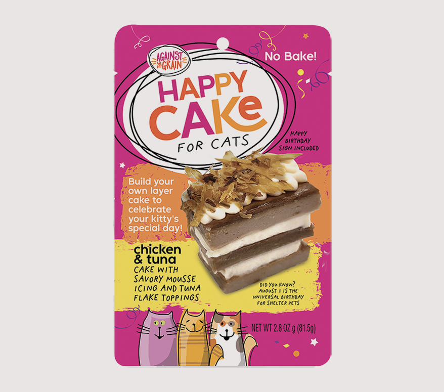 Because kitties deserve birthday cakes, too, AGAINST THE GRAIN PET FOOD introduces Happy Cake for Cats. The fun, no-bake layer cake lets pet parents build an easy, savory birthday cake with mousse-style layers, icing, and crunchy tuna flakes to sprinkle on top. In a Chicken & Tuna recipe, each festive kit comes in a convenient 2.8-oz pack. Also available: Happy Cake for Dogs in Chicken & Pumpkin. Made in the U.S.