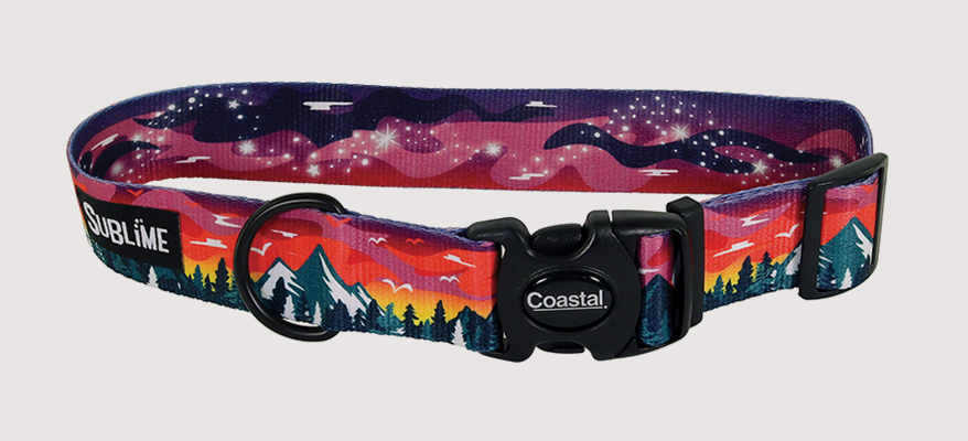 The Sublime Adjustable Dog Collar by COASTAL PET PRODUCTS comes in 14 bold designs, including this eye-catching Purple Mountain, and in wider-than-average sizes: S 3/4 in. M 1 in. and L 1 1/2 in. Made from 100% post‑consumer polyester, the two-sided complementary patterns create a unique look, while the durable black plastic buckle stands up to daily wear. Made in the U.S. “Best of Merchandising” catalog, updated POP materials with sizing guides and product benefits, Selling Specialist resources to enhance product knowledge, and educational YouTube videos available. Promoboxx provides ready-made social media content.