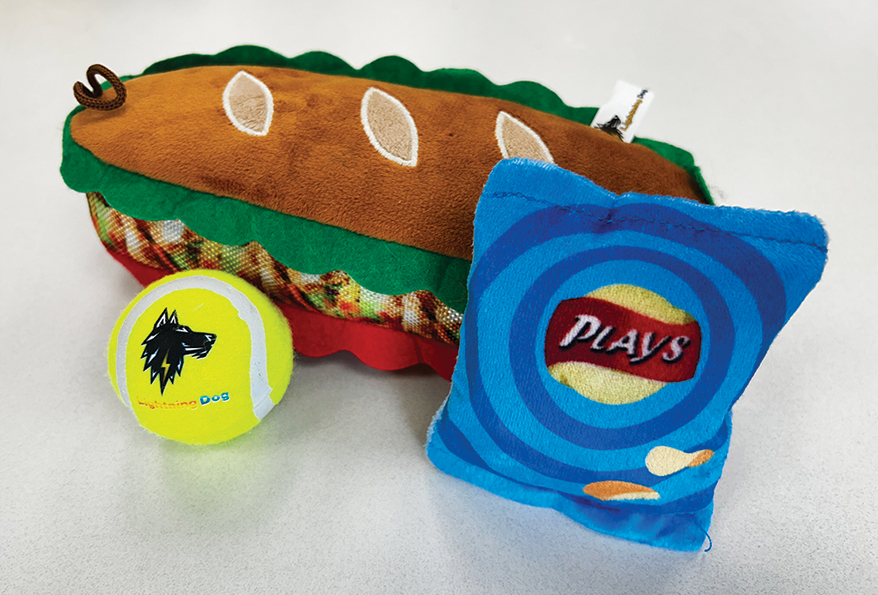 How cute is this Rowdy Foodie Sandwich from LIGHTNING DOG? The tough 6-in. toy features the brand’s power-weave technology, but once inside pups find a logo tennis ball plus a bag of Plays potato chips as the squeaker.