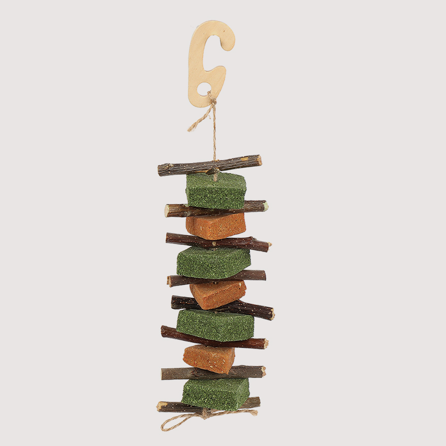 The Health-e Chew Stack from WARE PET PRODUCTS has plenty to keep rabbits, guinea pigs, chinchillas, hamsters and other small animals engaged while also supporting their dental health. Eight natural applewood sticks offer safe, long-lasting chewing; three carrot chews provide flavorful variety; and four alfalfa chews add texture and enrichment. The multi-textured chew toy features a sturdy wood hook and durable jute string, easily hanging in any habitat for convenient access and interactive play.