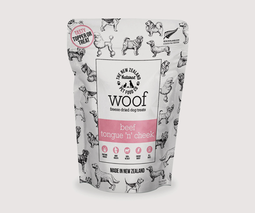 Who doesn’t love a good pun? THE NEW ZEALAND NATURAL PET FOOD CO sure does and proves it with Woof Beef Tongue ‘n’ Cheek for dogs. Made from tongue and cheek sourced from 100% New Zealand free-range beef, this single-protein treat comes packed with natural flavor and nutrients that support energy, muscle health and overall vitality. The rich texture and taste make it ideal for training, treating and adding variety to meals. 1.76 oz.