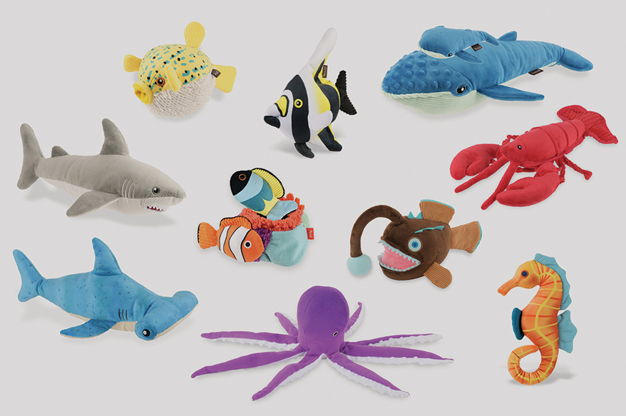 With the Ocean Buddies Collection, PLAY pet brands (formerly P.L.A.Y.) introduces its first larger toys for dogs. Great White Gabe and Bonk the Hammerhead as well as Big Blue the Whale, Opal the Octopus and Lemmy the Lobster — Lemmy the largest at 17.4 by 8.9 by 3.5 in. — swim alongside smaller sea friends, including the adorable Puffer Fish and Angler Fish! On informative, easy-to-merchandise backer cards to mix and match, every sale benefits Saving the Blue, helping to recover and restore threatened marine species and to connect people to ocean wildlife.