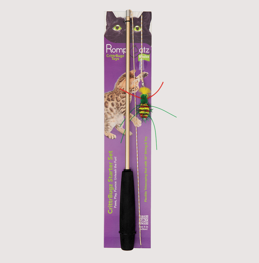 Retailers and cat customers alike appreciate that the ROMPICATZ CrittrBugz Starter Set offers improved durability and quality compared to similarly priced toys. The flexible telescoping rod features a new spider toy, which like the brand’s other interchangeable critters mimics the movements of bugs that cats naturally hunt. Compatibility allows for easy up or down selling into the Rompicatz Critter Collector Series and Adjustable String Wands. ISO, demo toys, photos and video clips, plus in-store marketing tools and training videos available. Exclusive distributor for Rompicatz:
