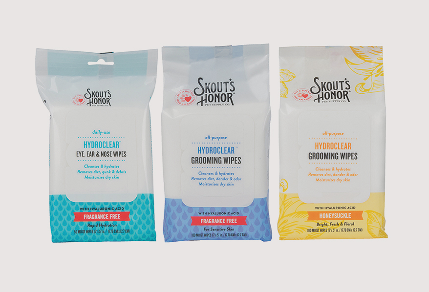 SKOUT’S HONOR adds to its hyaluronic-acid product line with HydroClear Grooming Wipes. A fast, easy way to keep pets clean, refreshed and smelling great, they remove dirt, dander and odor from faces, paws, skin folds and bums, while delivering rapid hydration to support skin resilience. In Honeysuckle and Fragrance-Free. 100 count. Also in the line: fragrance-free HydroClear Eye, Ear & Nose Wipes for more sensitive skin areas. In 50 count; 6 pack PDQ display. Made in the U.S.
