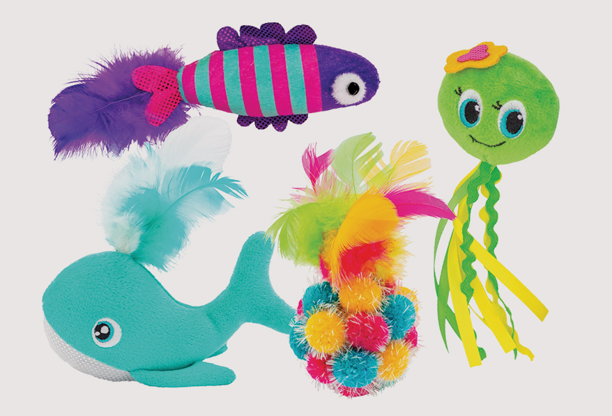 How cute are these Sea Life Cat Toys from THOOZYPET? The colorful assortment and catnip fills spark natural hunting instincts and keep kitties engaged. Featuring a mix of plush characters, feathers, ribbons, bells and interactive teaser options, the collection offers strong shelf appeal, great value, high margins and repeat-buy excitement. 4-18 in.