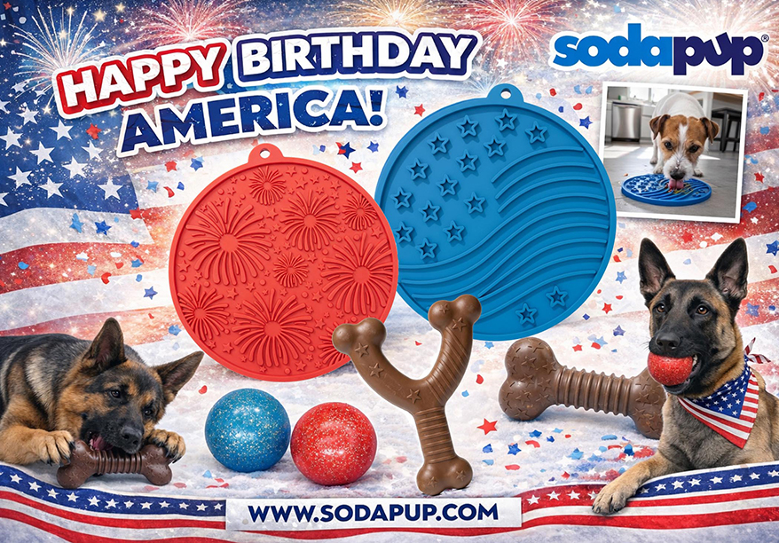 (PRESS RELEASE) BOULDER, CO — As the nation prepares to celebrate its heritage and look forward to the historic 250th anniversary of the signing of the Declaration of Independence, SodaPup, a leader in American-made dog enrichment products, announced the launch of its Fourth of July Collection. This commemorative line of USA-K9 branded durable chew toys and enrichment mats combines patriotic pride with the high-quality, non-toxic materials SodaPup is known for.